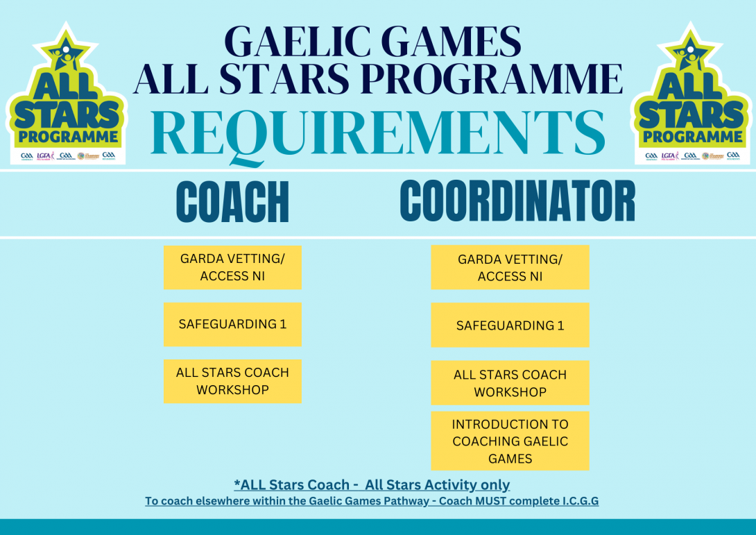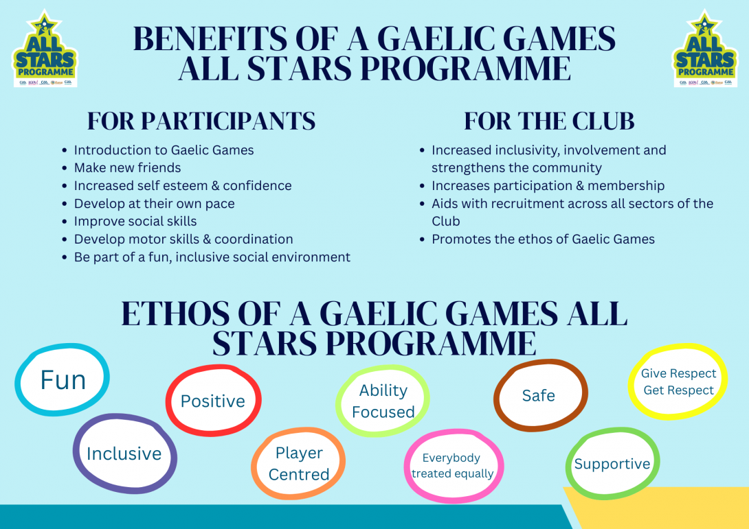 The Gaelic Games All Stars Programme caters for the needs of all participants in an inclusive, supportive environment, led by volunteers. The All Stars Programme is player centred with a focus on physical literacy and offers a sense of belonging to all