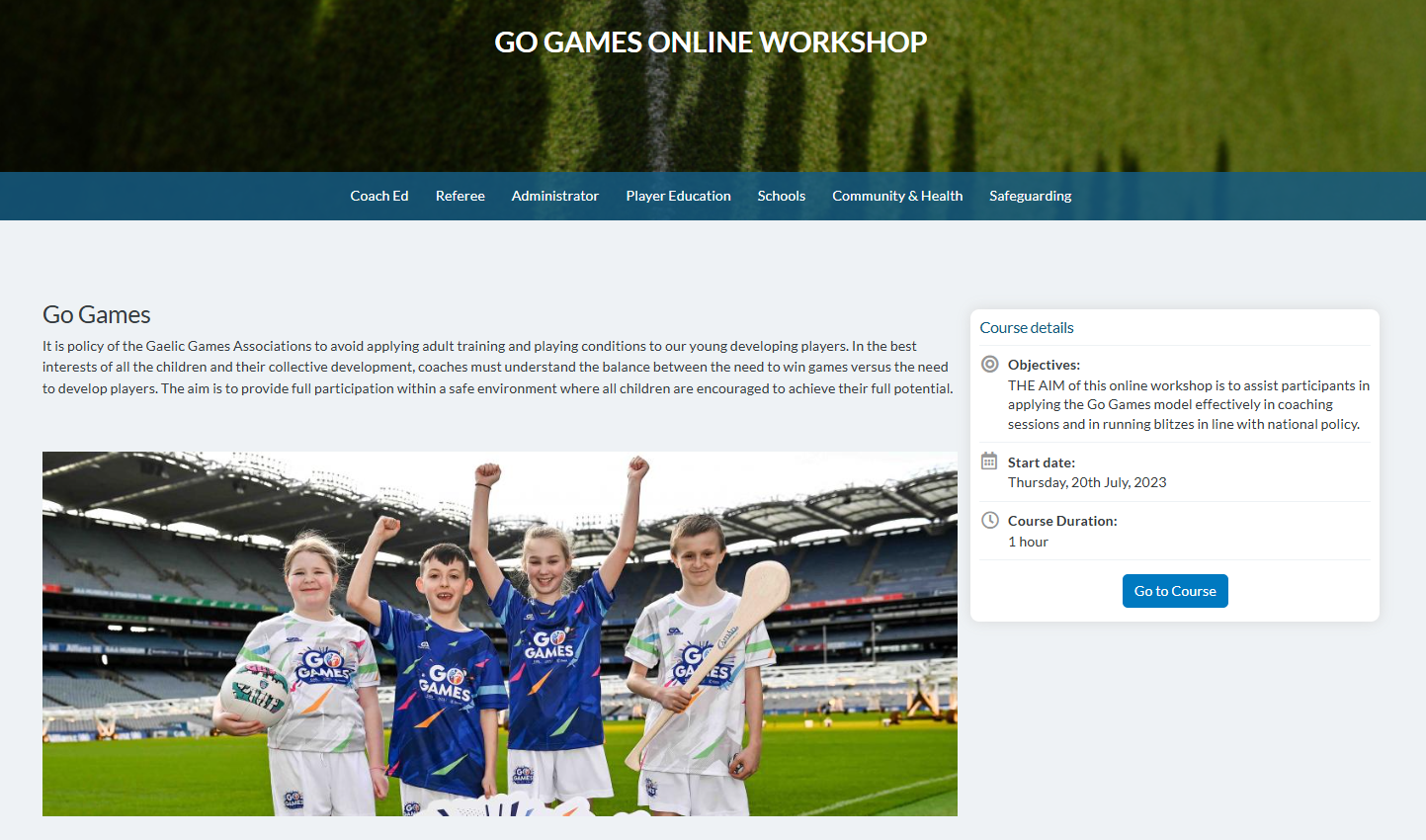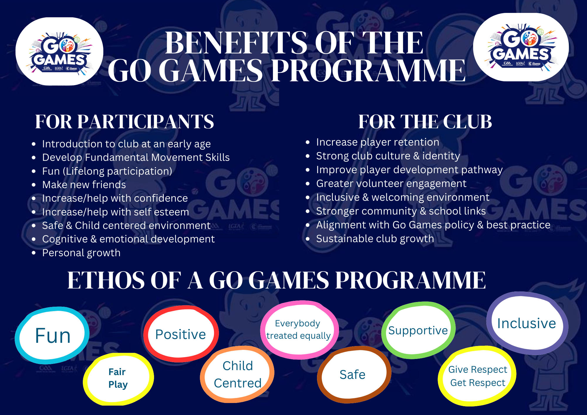 Go Games are Camogie, Hurling and Gaelic Football for children up to and including 12 years of age, where every child gets to play (a Go) in every game, for the full game.